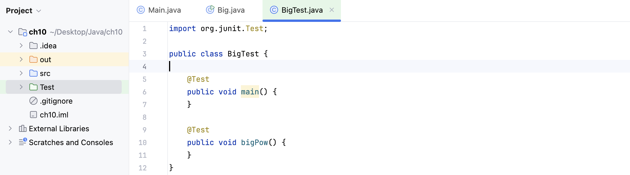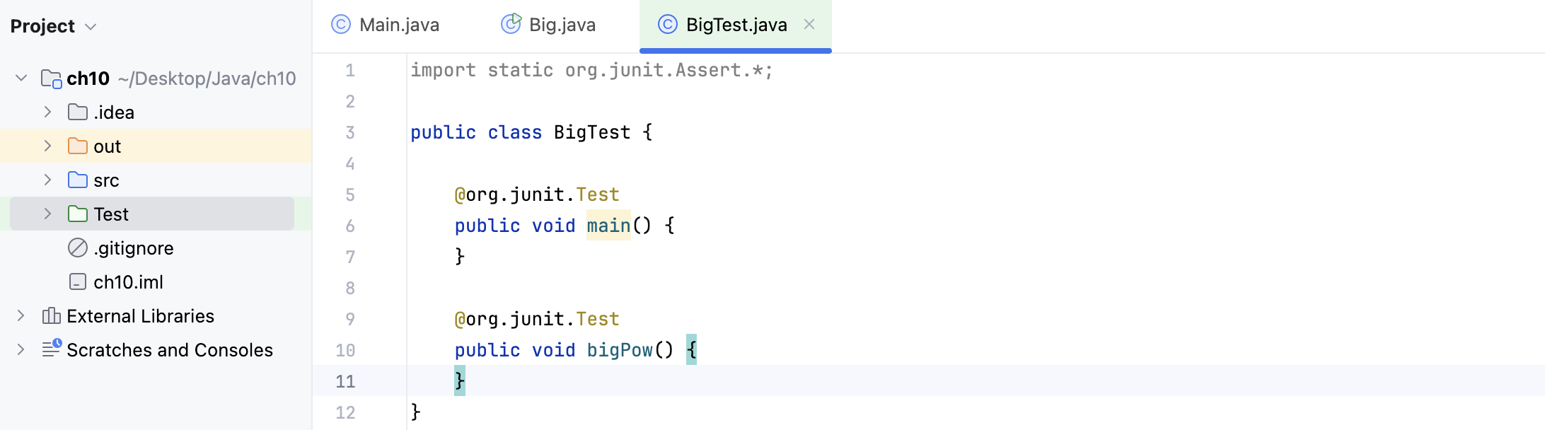 在 project 下新建 Test 文件夹,标记该文件夹: Mark Directory as > Test Sources Root