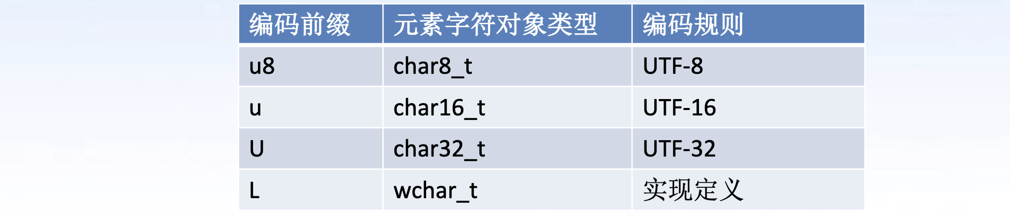 - 5 种编码前缀: 无编码、u8、u、U、L. 例如: "hello" u8"hello" u"hello" U"hello" L"hello"