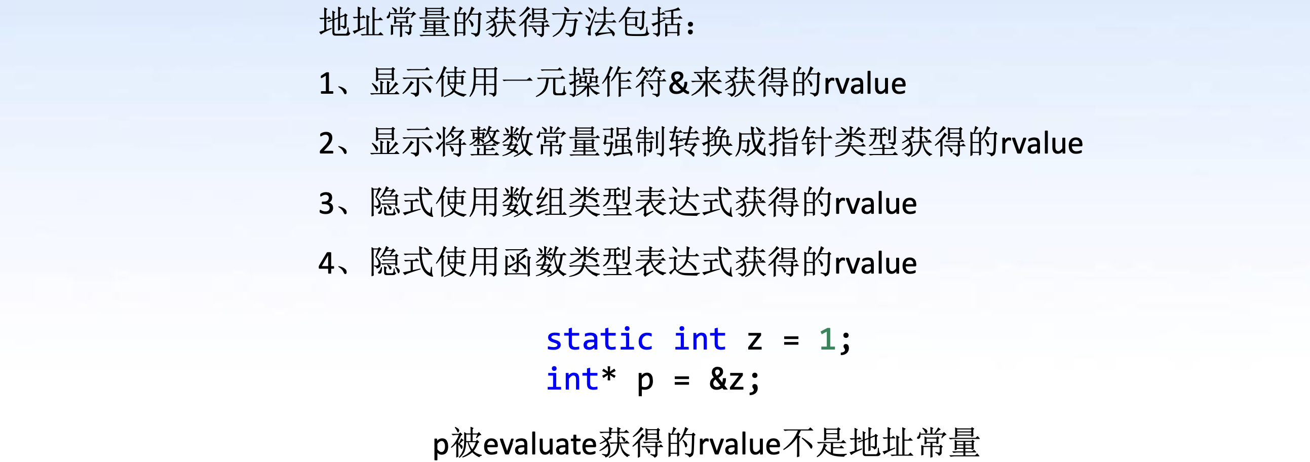 &z得到的 rvalue 是地址常量"hello"是地址常量 (因为隐式地用数组开头的'h') (字符串分配对象都具有 static 的 storage duration)