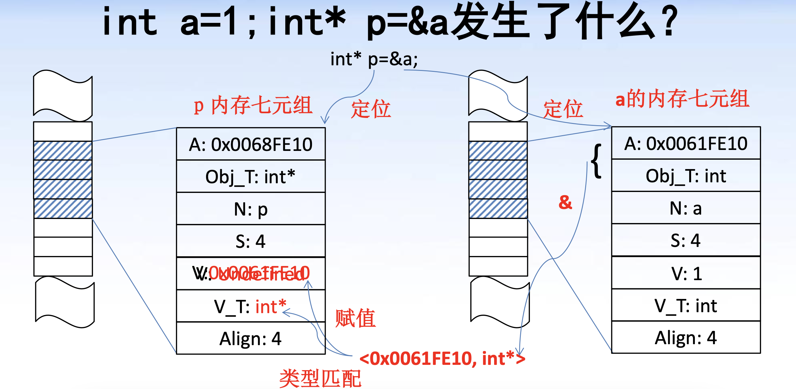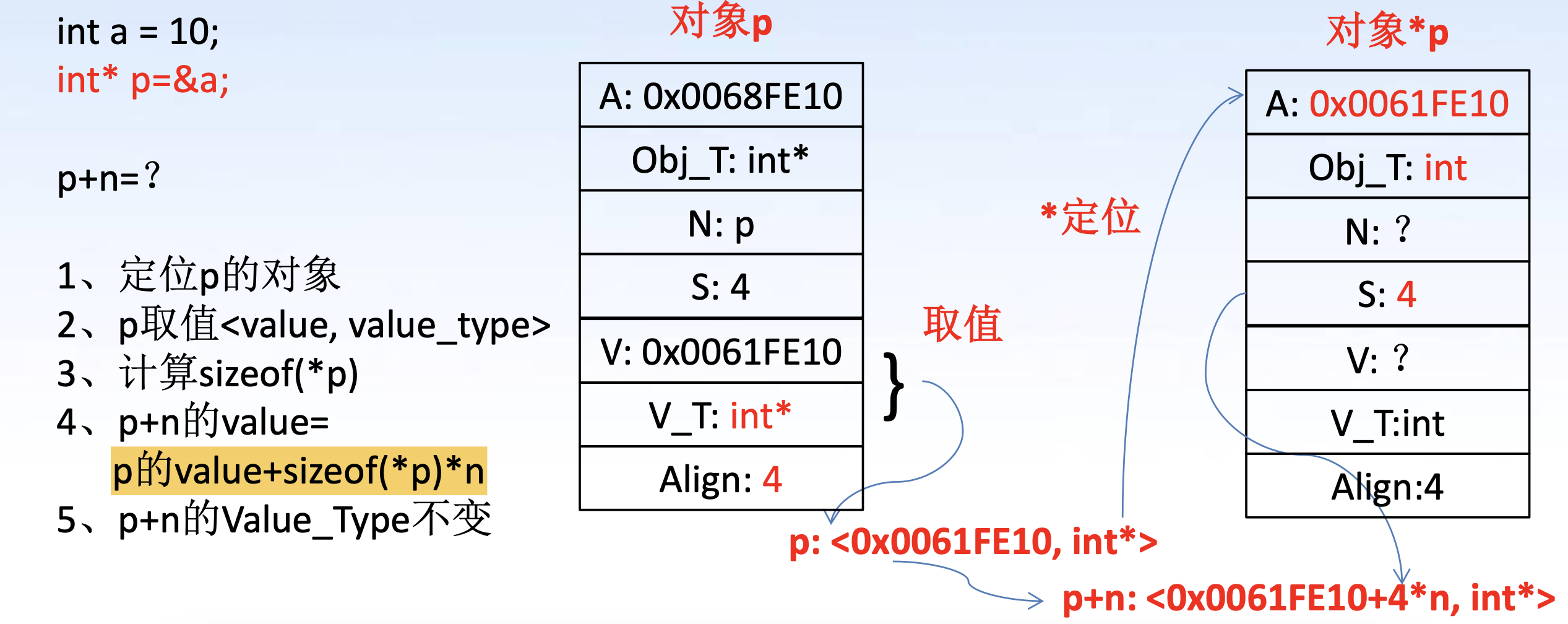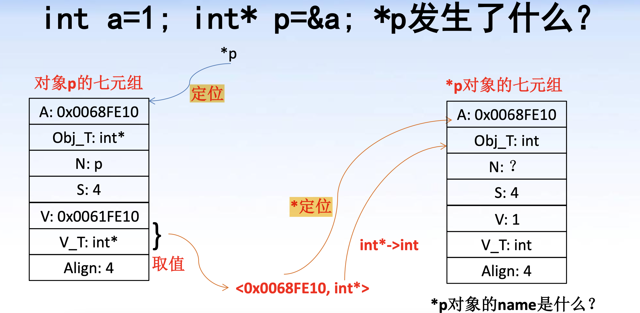 假设表达式 exp evaluate 之后的 rvalue 为 <Value, Value_Type> , 如果 Value_Type 是对象指针类型, 则可以用 *exp 的方式来定位到 Value 对应字节编号开头的一段内存 (也就是一个对象 M)
