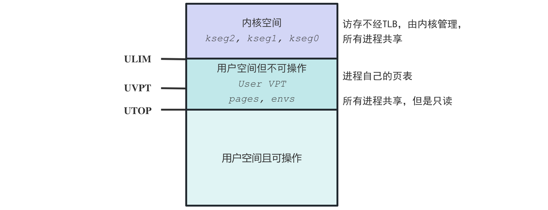 在 env_init 的最后,我们还需要做一件事,就是创建一个 “模板页目录”,设置该页将 pages 和 envs (即所有页控制块和所有进程控制块的内存空间) 分别映射到 UPAGES 和 UENVS 的空间中 (即下图的pages和envs地带)。并且在后续进程创建新的页目录时,也要首先复制模板页目录中的内容。这样做的目的是使得用户程序也能够通过 UPAGES 和 UENVS 的用户地址空间获取 Page 和 Env 的信息。