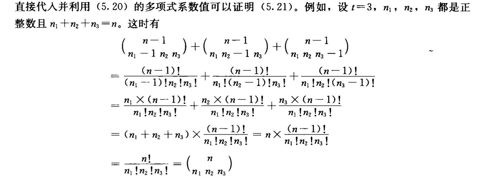 证明 展开并选择,选 \(n\) 个因子中 \(n_1\) 个 \(x_1\),剩下 \(n-n_1\) 中选 \(n_2\) 个 \(x_2\),\(\cdots\) ,最终得到 \(x_1^{n_1}x_2^{n_2}\cdots x_t^{n_t}\) 项,项的出现次数为
