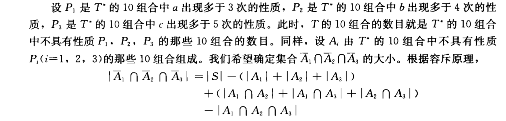 把容斥原理应用到 \(T^{*} = \{\infty \cdot a, \infty \cdot b, \infty \cdot c\}\) 的所有10组合的集合 \(S\) 上