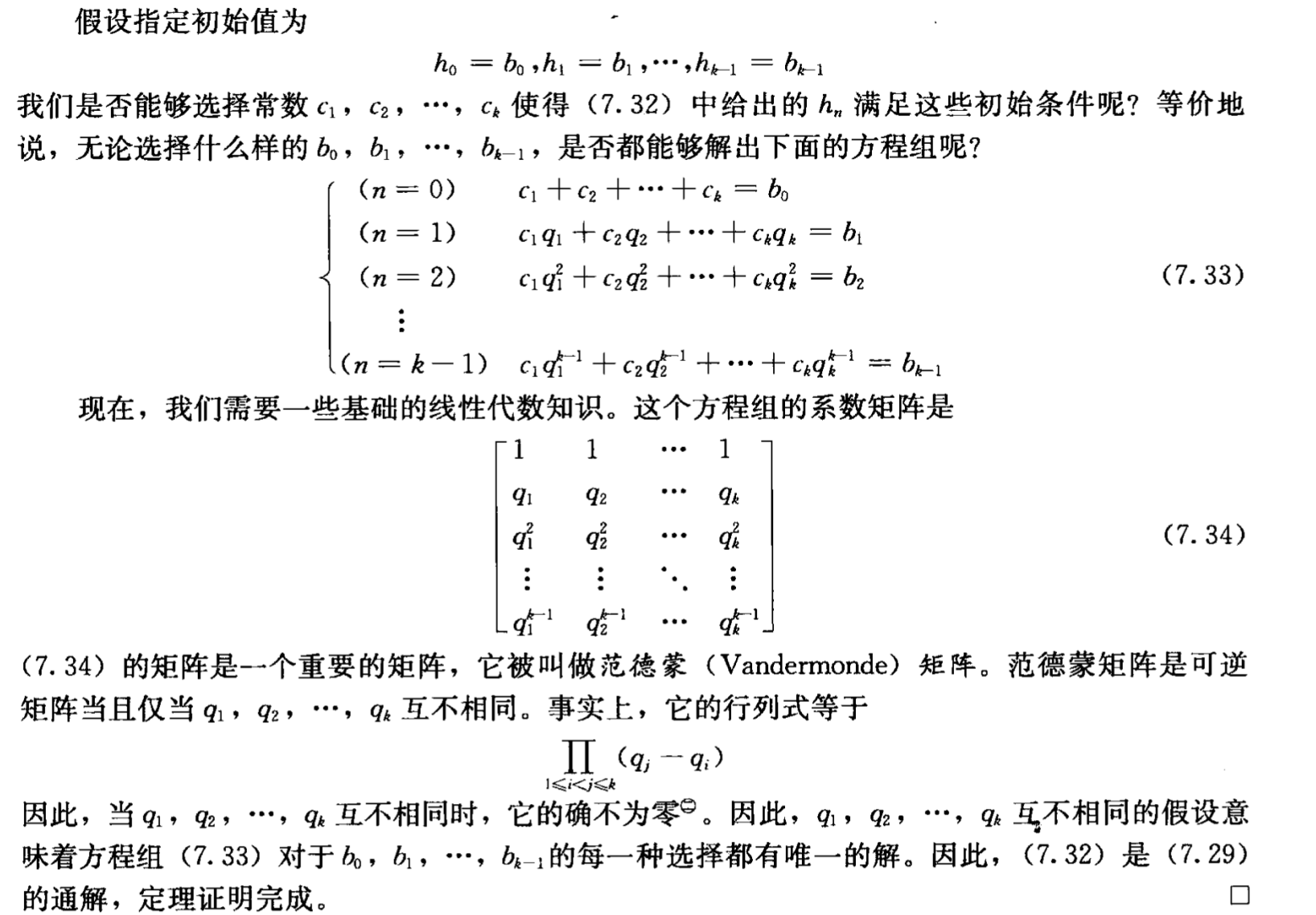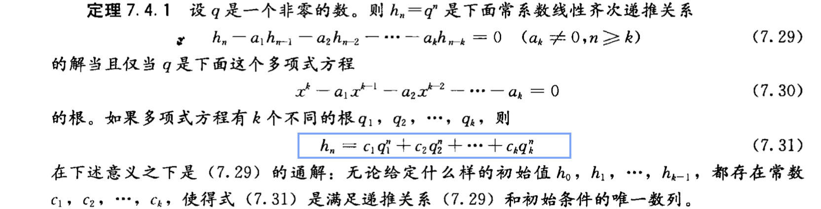 多项式方程 7.30 称为递推关系的特征方程 (characteristic equation) ,它的 \(k\) 个根称为特征根 (characteristic root)