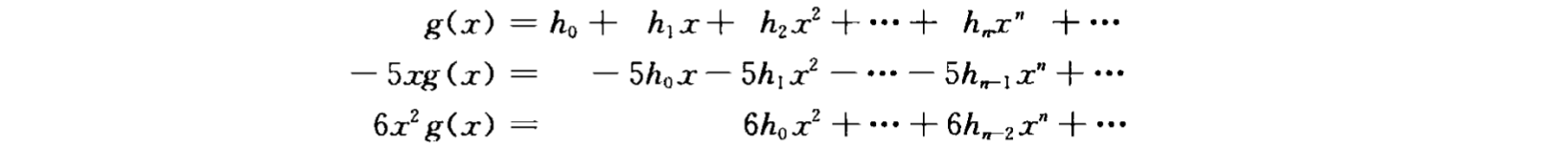 设 \(g(x)\) 是 \(\{h_n\}\) 的生成函数,并且我们分别用 \(-5x\) 和 \(6x^2\) 乘以 \(g(x)\) ,得