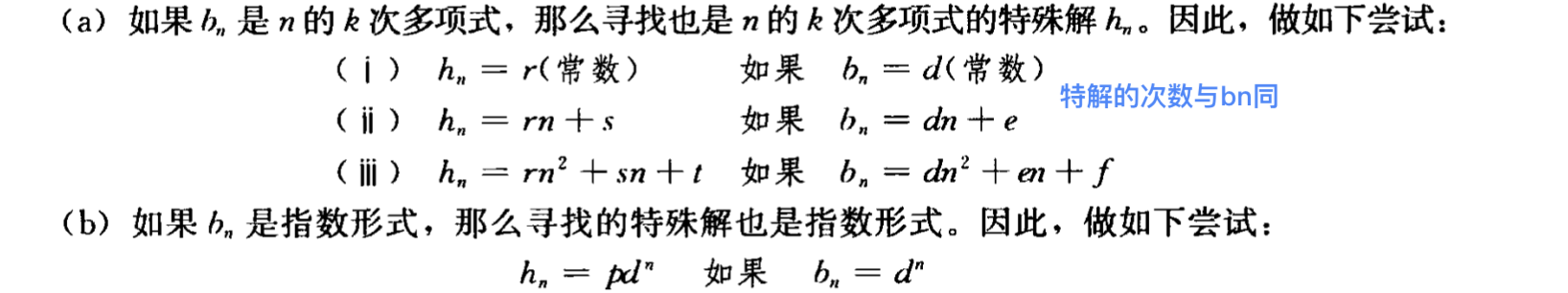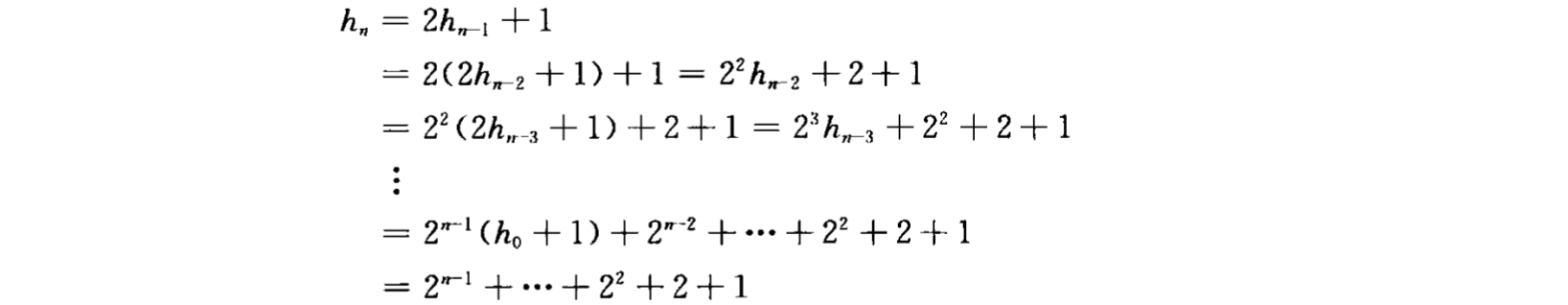 例子 (汉诺塔问题): \(h_n\) 是转移 \(n\) 个圆盘所需移动次数,有 \(h_0=0,h_1=1,h_2=3\) ,且有递推关系: $$ h_n=2h_{n-1}+1 $$ 解法1 (直接递推) :