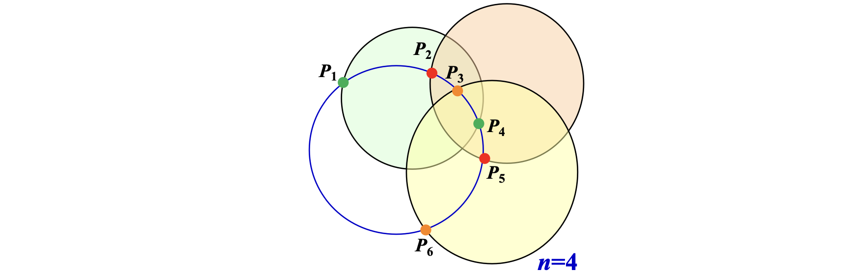 递推关系 (\(n\geqslant 2\)): 第 \(n\) 个圆与前 \(n-1\) 个圆相交于 \(2(n-1)\) 个交点,形成第 \(n\) 个圆上的 \(2(n-1)\) 条弧