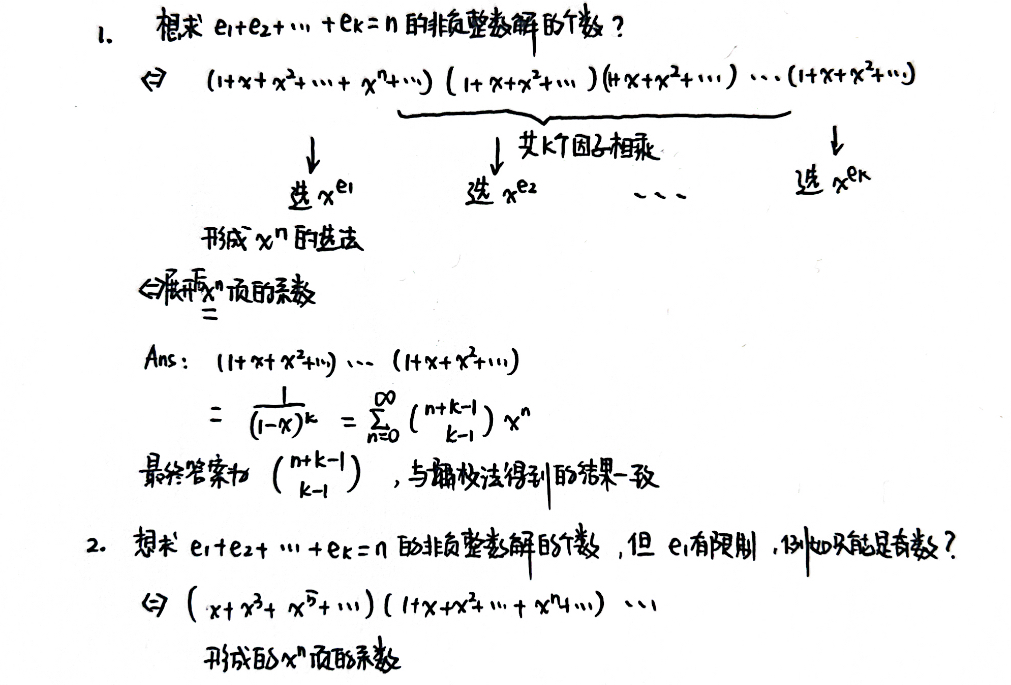 \(x^{e_1}\) 是第一个因子的代表项,\(x^{e_2}\) 是第二个因子的代表项,……,将这些代表项相乘,得到 \(x^n\) ,且有 \(x^n\) 的系数等于 \(e_1+e_2+ \cdots + e_k = n\) 的非负整数解的个数