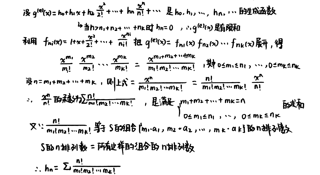 定理 设 \(S\) 是多重集合 \(\{n_1 \cdot a_1, n_2 \cdot a_2, \cdots, n_k \cdot a_k\}\),其中 \(n_1, n_2, \cdots, n_k\) 是非负整数。设 \(h_n\) 是 \(S\) 的 \(n\) 排列数,那么数列 \(h_0, h_1, \cdots, h_n, \cdots\) 的指数生成函数由下式给出: