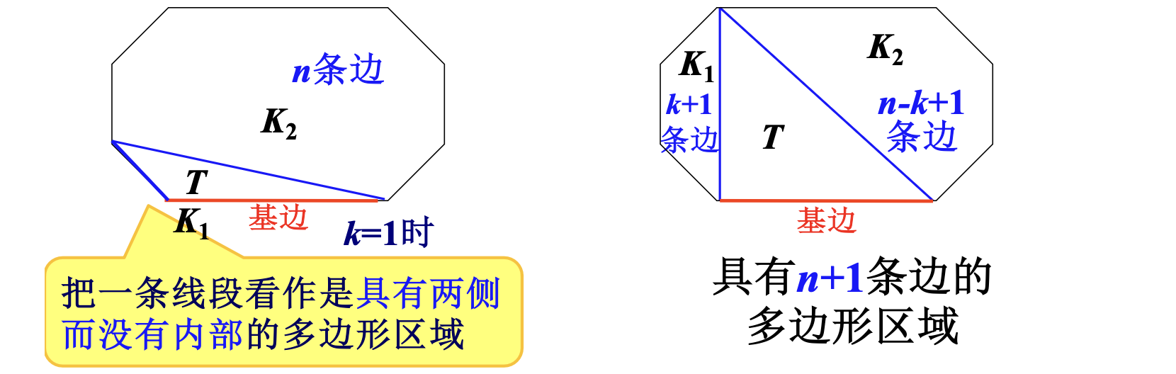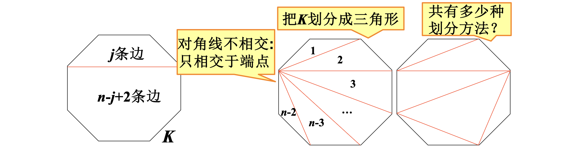 - \(K\) 的每条对角线把 \(K\) 分成两个区域: \(j\) 条边的凸多边形和 \(n-j+2\) 条边的区域