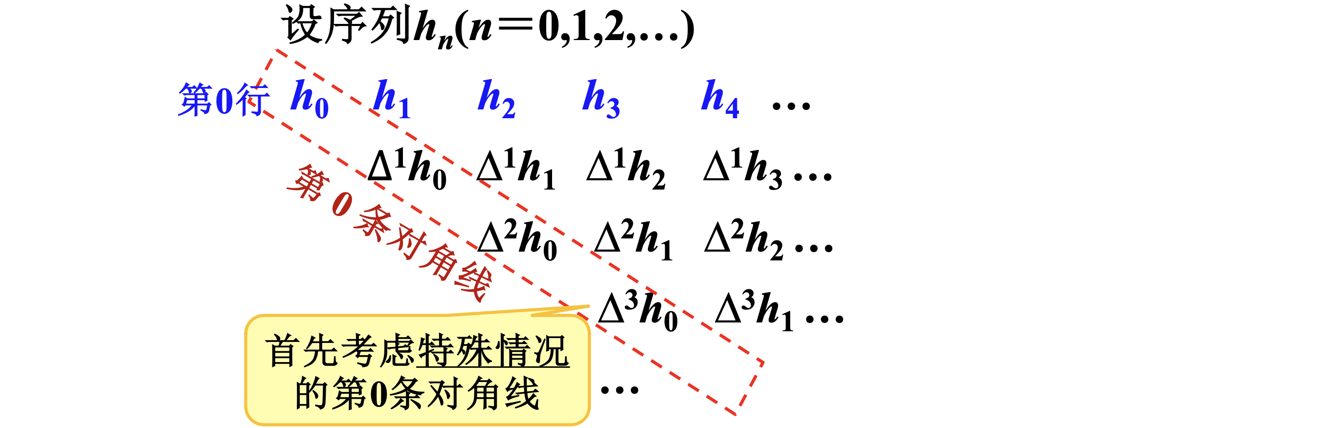 设 \(h_0, h_1, \cdots, h_n, \cdots\) 是一个序列,我们定义其一阶差分序列为 \(\Delta h_0, \Delta h_1, \cdots, \Delta h_n, \cdots\),其中 $$ \Delta h_n = h_{n+1}-h_n \space (n\geqslant 0) $$ 还可以定义 \(p\) 阶差分序列, $$ \Delta^ph_n = \Delta(\Delta^{p-1}h_n) $$ 0阶差分序列就是自己