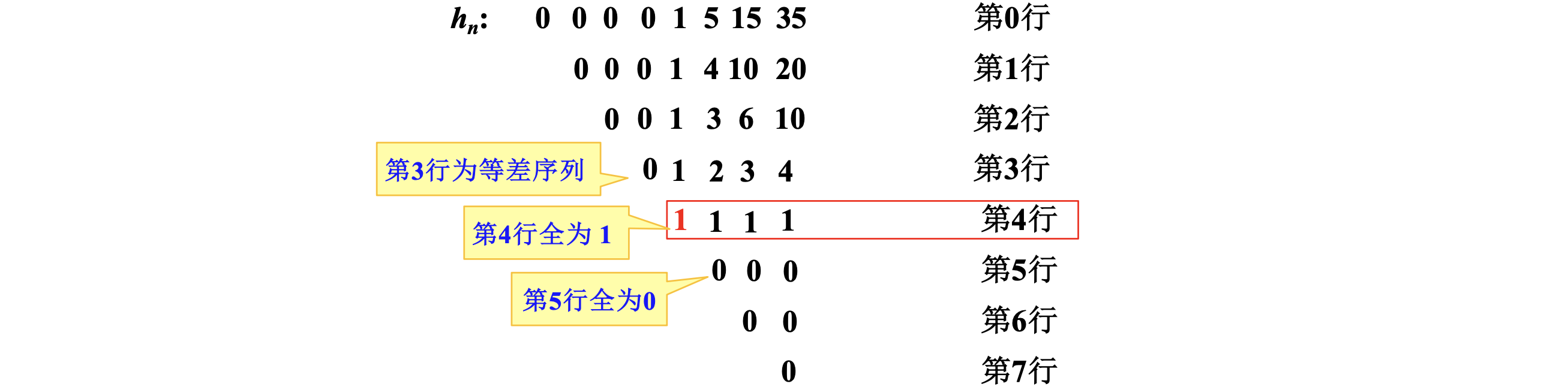 因为第5行起均为0,所以 \(h_n\) 应该是 \(4\) 次多项式,而且有 \(h_0 = h_1 = h_2 = h_3 = 0\) ,所以设