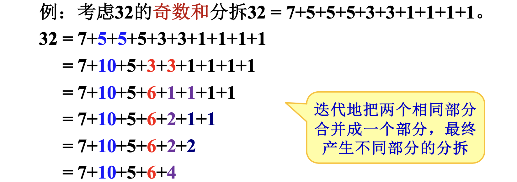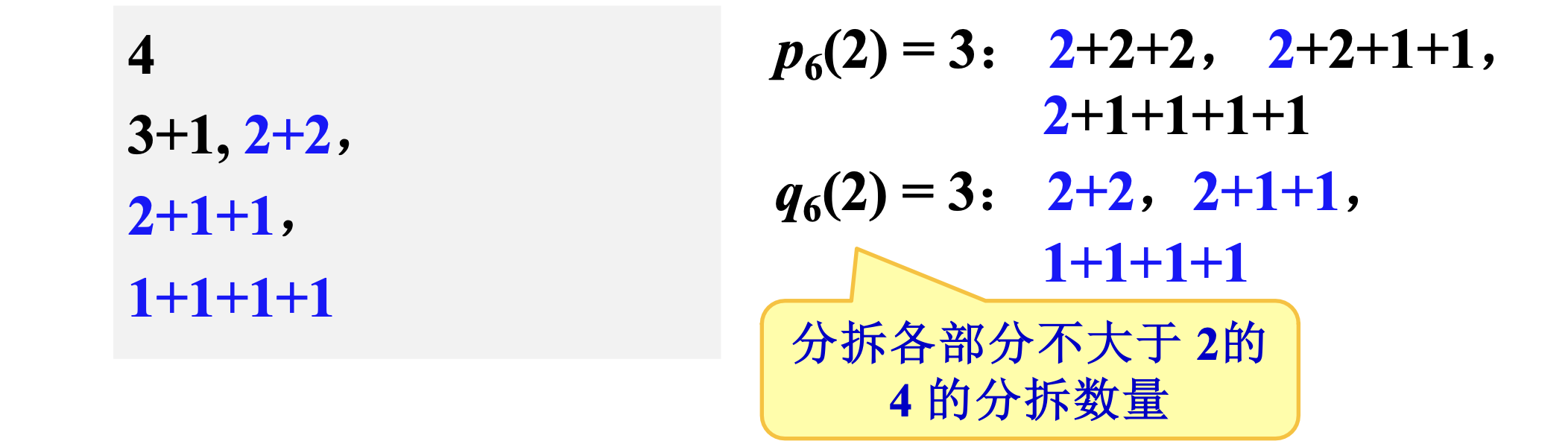 \(n\) 的分拆 (partition) 就是把 \(n\) 写成多个正整数的和,例如 \(4\) 的分拆: \(4,3+1,2+2,2+1+1,1+1+1+1\)