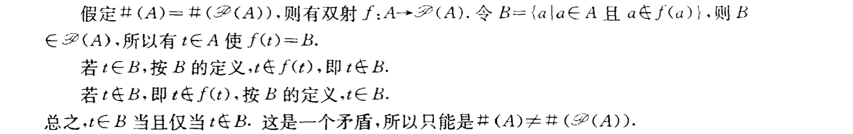定理 对每个集合 \(A\),皆有 \(\#(A) < \# \mathcal{P}(A)\)