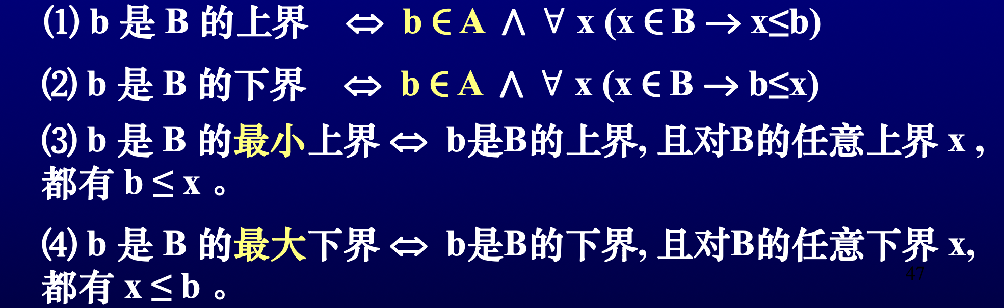 偏序关系: \(R \subseteq P \times P\) 称为偏序关系当且仅当 \(R\) 是 自反的,反对称的 和 传递的