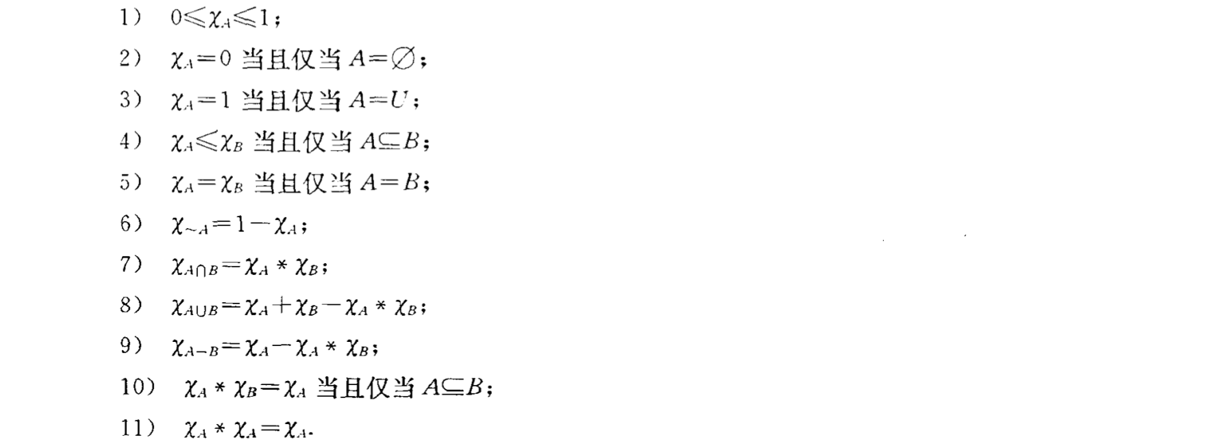 特征函数: \(U\) 为全集,\(A \subseteq U\),定义 \(\chi_A: U \rightarrow \{0,1\}\),