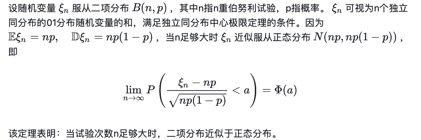 应用: 设 \(X_1, \cdots ,X_n\) 独立且同为二项分布,\(P(X_i = 1) = p\),则 \(Y_n = \sum\limits_{i = 1}^{n}X_i \sim B(n,p)\) 可以近似认为 \(Y_n \sim N(np,np(1-p))\)