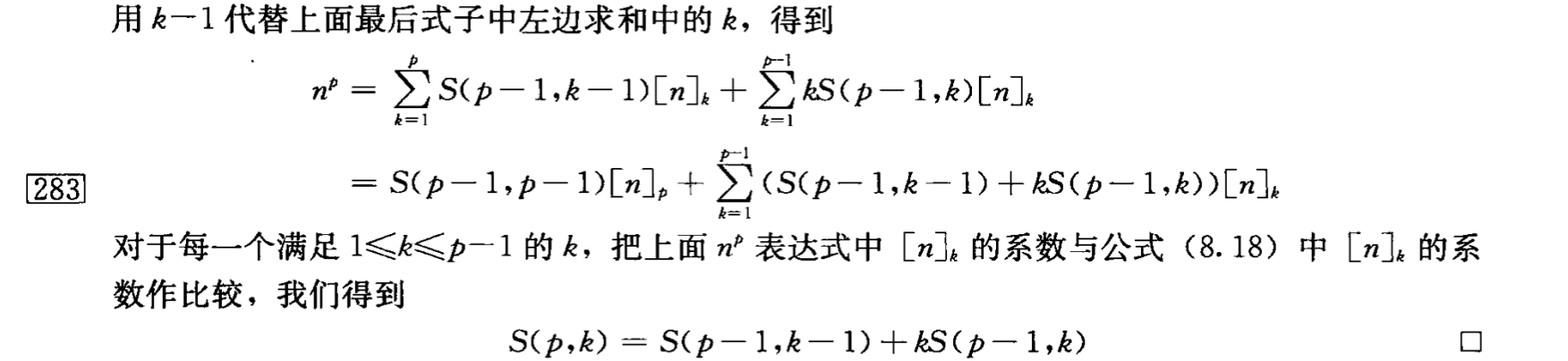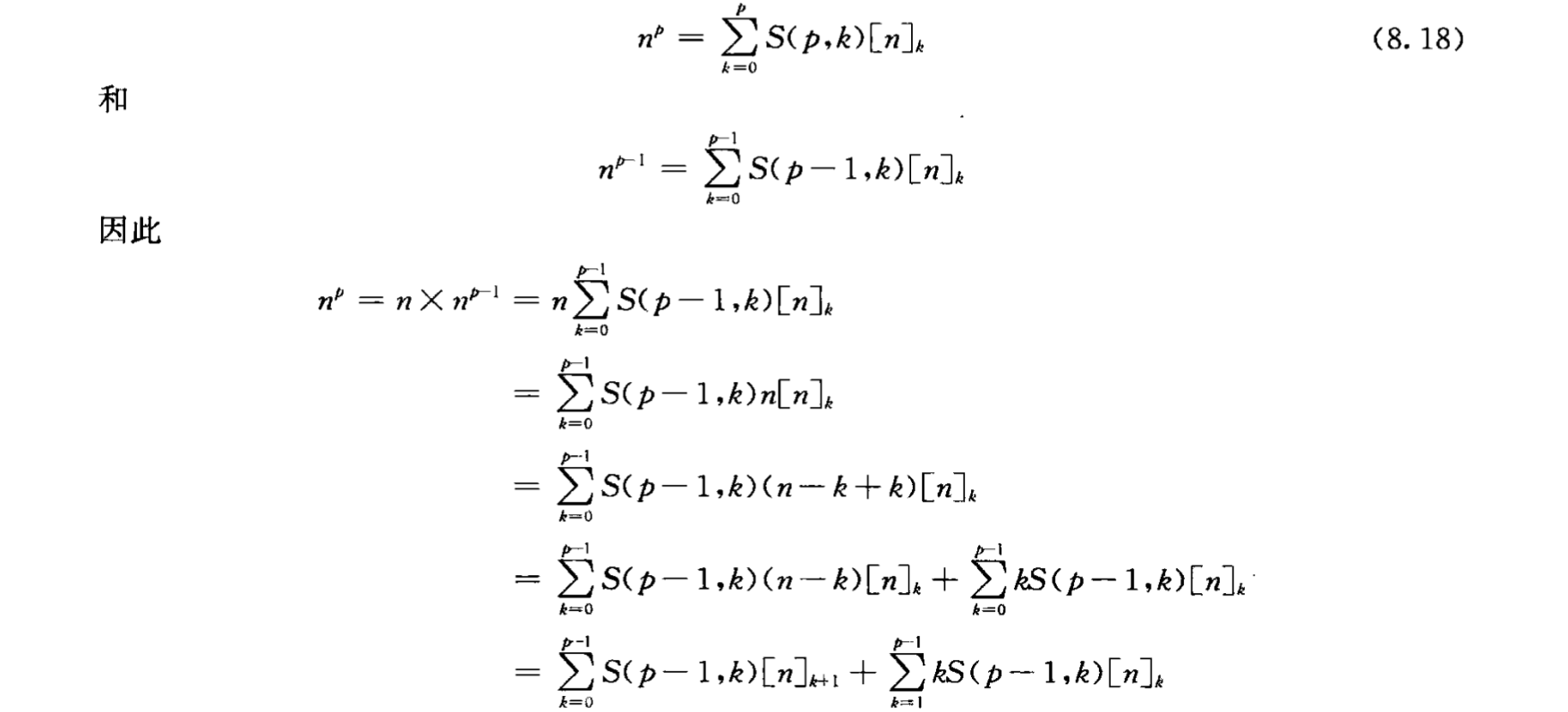 我们之前算的是 \(n^p = f([n]_1, [n]_2, \cdots, [n]_p)\) ,然后又观察 \([n]_2 = n(n-1) = n^2 - n\) ,所以想 \([n]_p = g(n^p, n^{p-1}, \cdots , n^0)\)