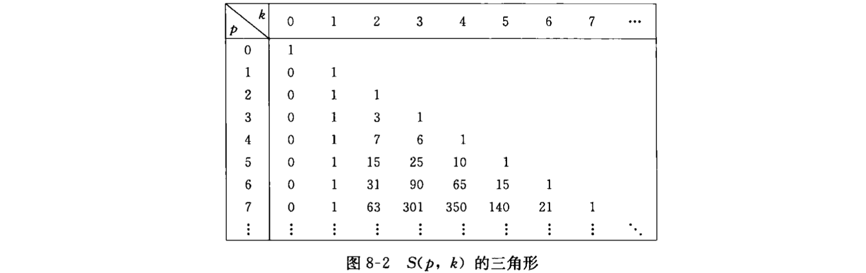 如果 \(1\leqslant k \leqslant p-1\) ,则 $$ S(p, k) = k S(p-1, k) + S(p-1, k-1) $$ 发现第二类Stirling数满足 Pascal-like 的递推关系 (不看系数 \(k\) 不就是 Pascal 么)
