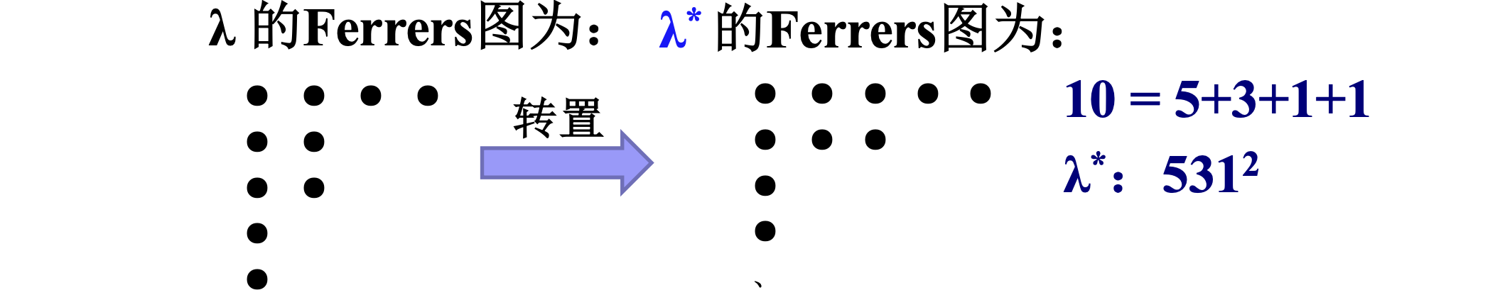 分拆 \(\lambda\) 的共轭分拆 (conjugate partition) \(\lambda^*:\) 把Ferrers进行转置