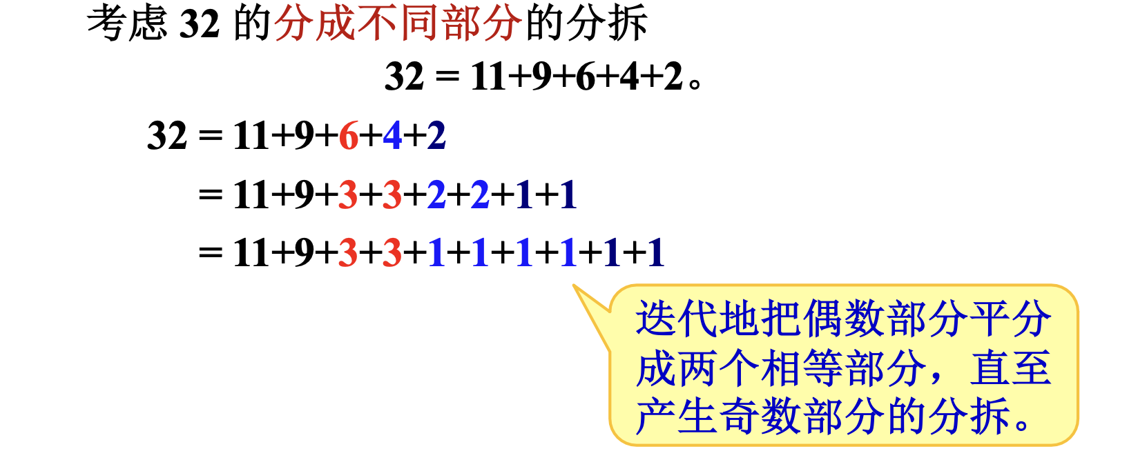 \(n\) 的分拆 (partition) 就是把 \(n\) 写成多个正整数的和,例如 \(4\) 的分拆: \(4,3+1,2+2,2+1+1,1+1+1+1\)