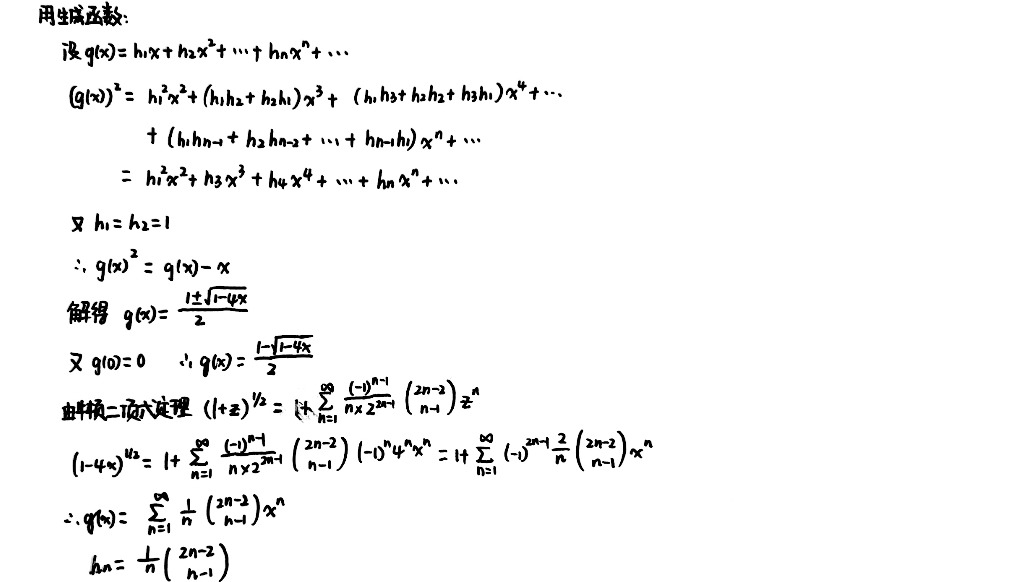共有 \(h_n = \sum\limits_{k=1}^{n-1}h_k h_{n-k}\) ,递推关系得证