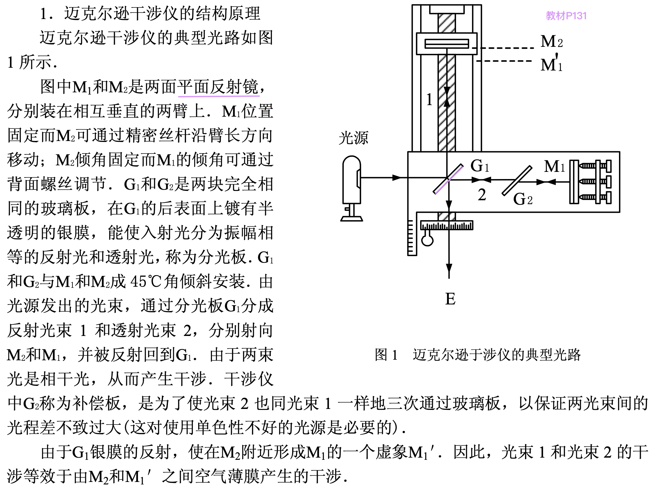 光学|复习¶ 迈克耳孙干涉仪¶ 如果 M2 与 M1' 平行 \(\Rightarrow\) 等倾干涉 不平行 \(\Rightarrow\) 等厚干涉 当 M1 每平移 \(\frac{\lambda}{2}\),视场中就有一条明纹移过。移过 N 条明纹,则平移 \(d = N \frac{\lambda}{2}\)