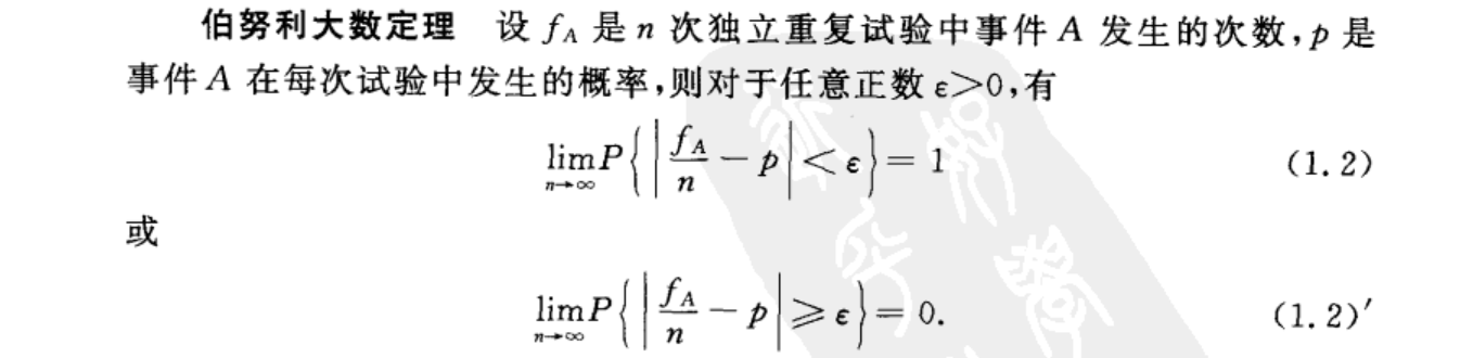 理解: 当 \(n\) 很大时,事件的频率 \(\frac{f_A}{n}\) 与概率 \(p\) 的偏差很小。所以,当试验次数很大时,便可以用事件的频率来代替事件的概率