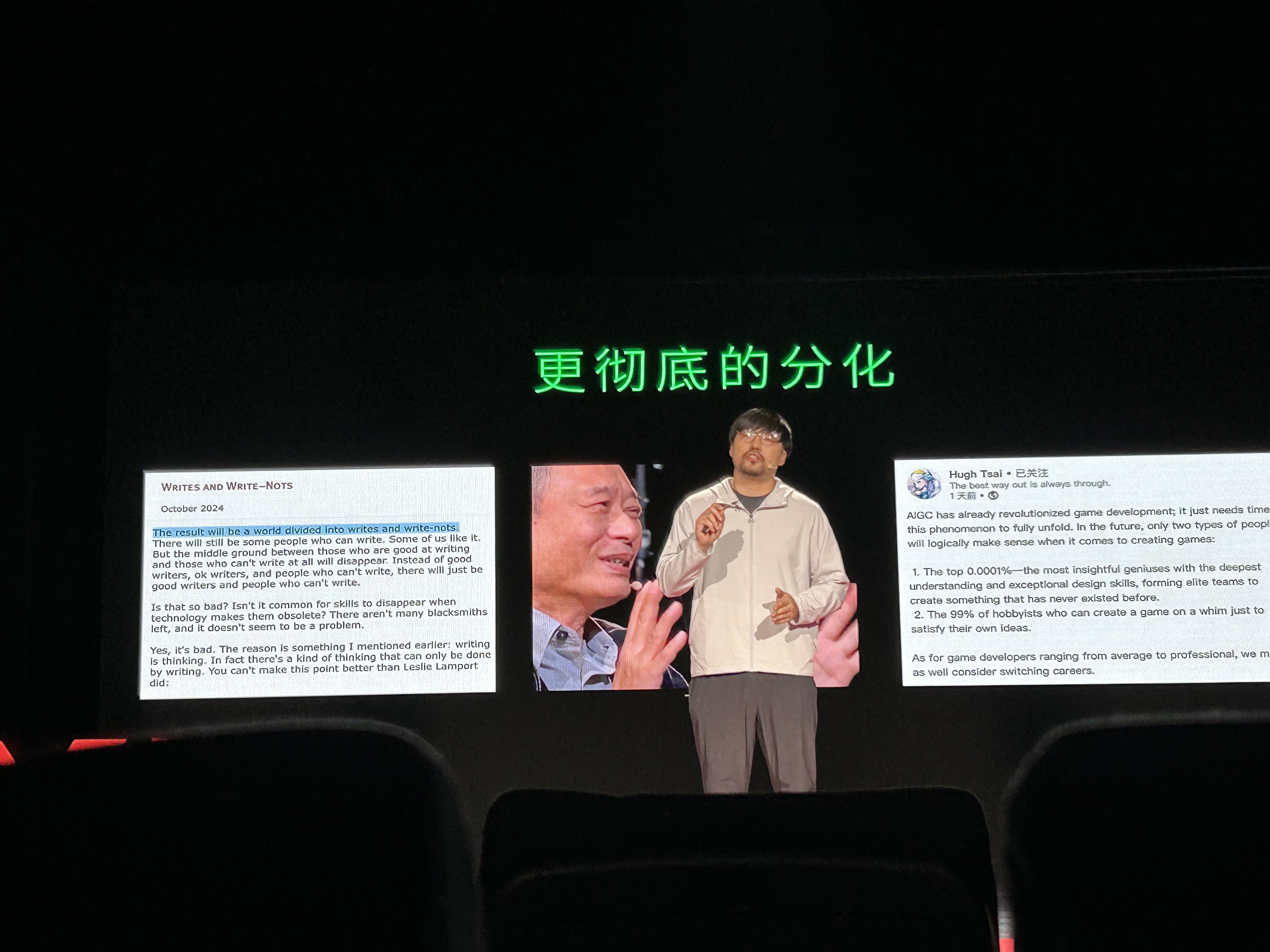 其次是AI会加大人与人之间的差异。LLM对专业性的要求会变高,类比助理与医生,助理给出诊断建议,医生确认。赵汗青老师说,会产生更彻底的分化,thinks and think-nots,重要的是,成为信息整合能力强的人,维度高的人。就跟相机没有取代画师一样,AI也不会取代创作者,相机背后思考的眼睛是不一样的,审美是不同的。“创作的同权不等于同质”。